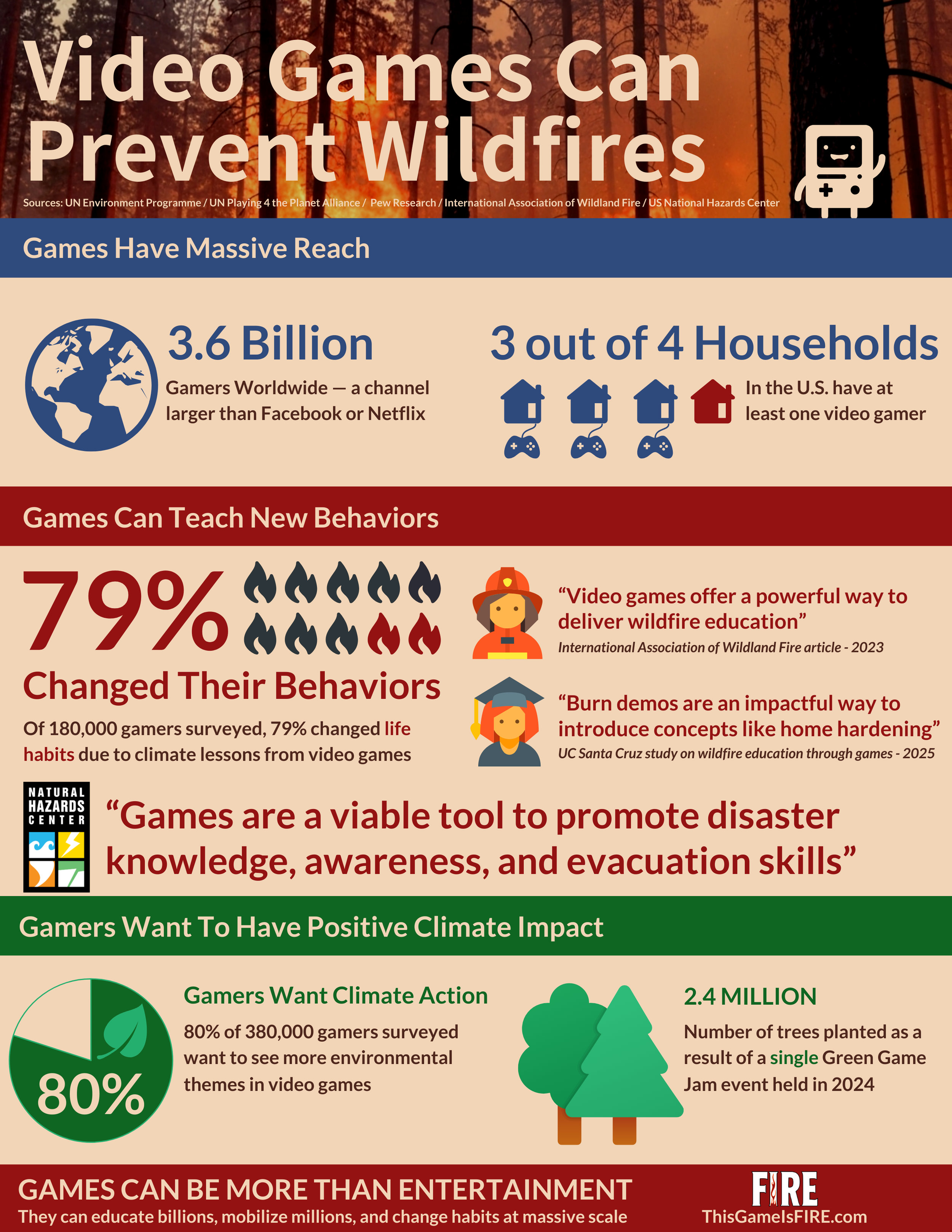 An infographic we created to help explain how video games can impact the wildfire crisis.